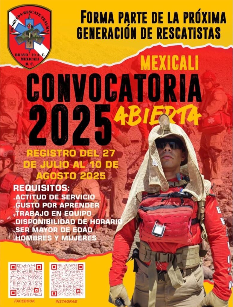 Mexicali.- El grupo de rescate Bravo 10 anunció su convocatoria anual para incorporar nuevos integrantes a sus filas, con el objetivo de reforzar su labor en situaciones de emergencia en zonas de difícil acceso; la invitación está dirigida a personas mayores de edad que deseen capacitarse y sumarse de forma voluntaria a esta organización con más de tres décadas de experiencia en la atención de rescates en entornos agrestes del municipio.