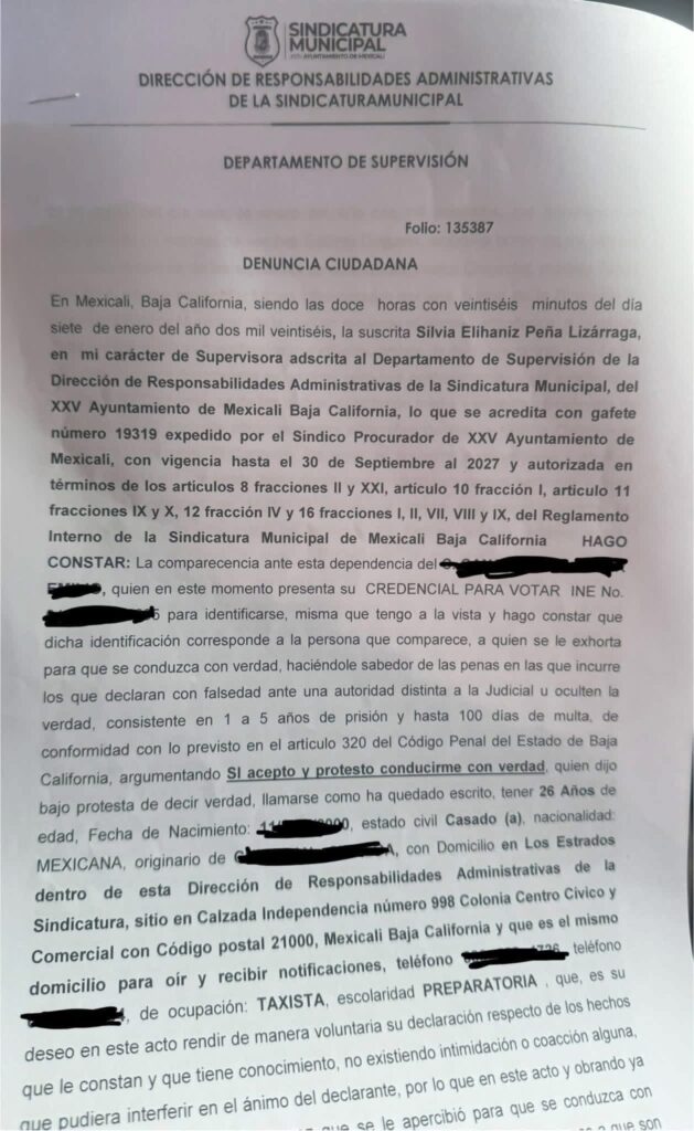 Mexicali.-La Sindicatura Municipal mantiene abierta una investigación contra el agente de Tránsito Eduardo Alejandro, señalado por una familia por el presunto robo de 5 mil pesos durante una detención vial por una luz trasera fundida, y en el marco de ese proceso ya se solicitó evidencia institucional para esclarecer los hechos.