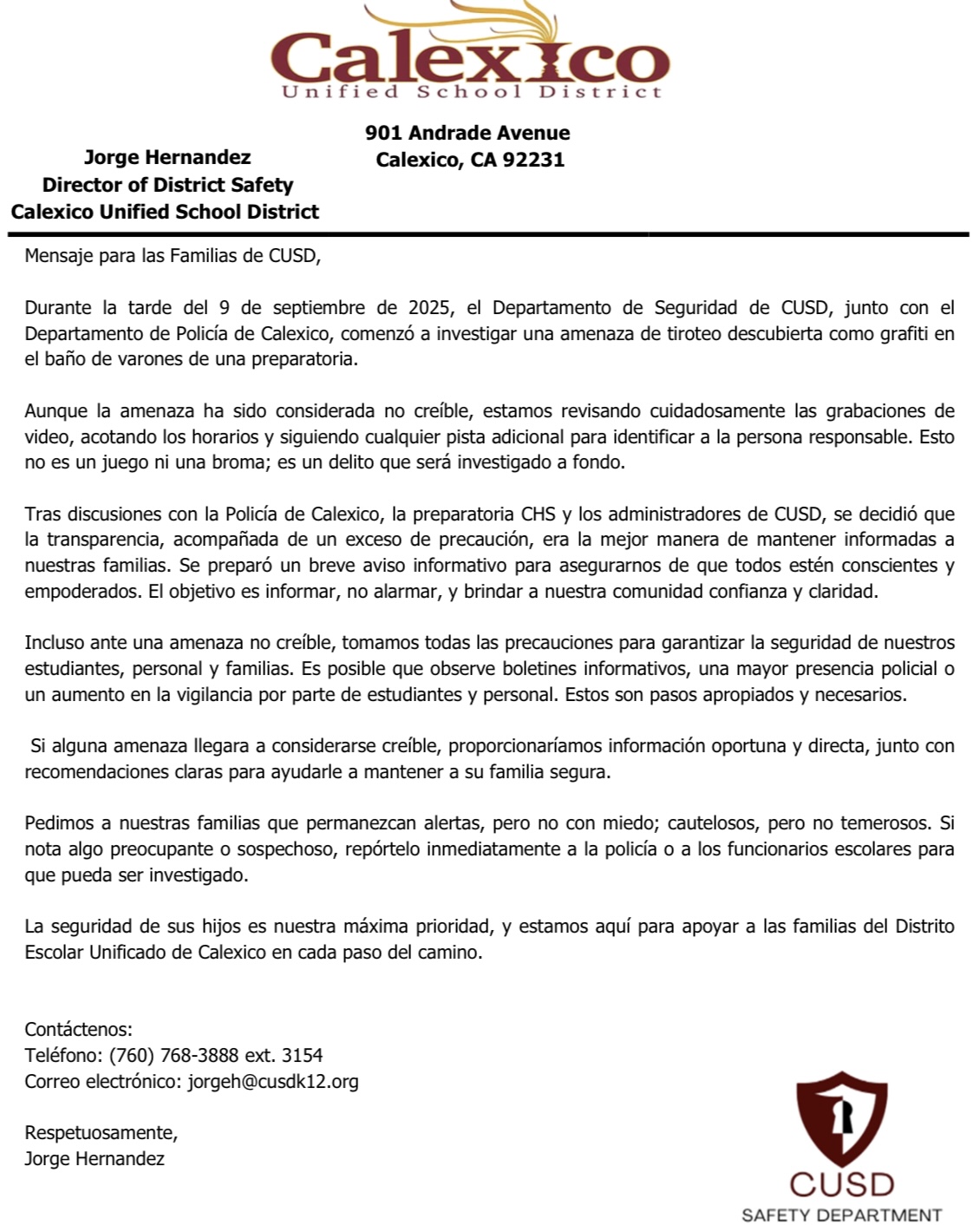 En coordinación con la preparatoria CHS y los administradores de CUSD, se decidió emitir un aviso público para garantizar la transparencia y reforzar la seguridad, como medida preventiva, la escuela aumentará la presencia policial, la vigilancia interna y la comunicación constante con las familias.