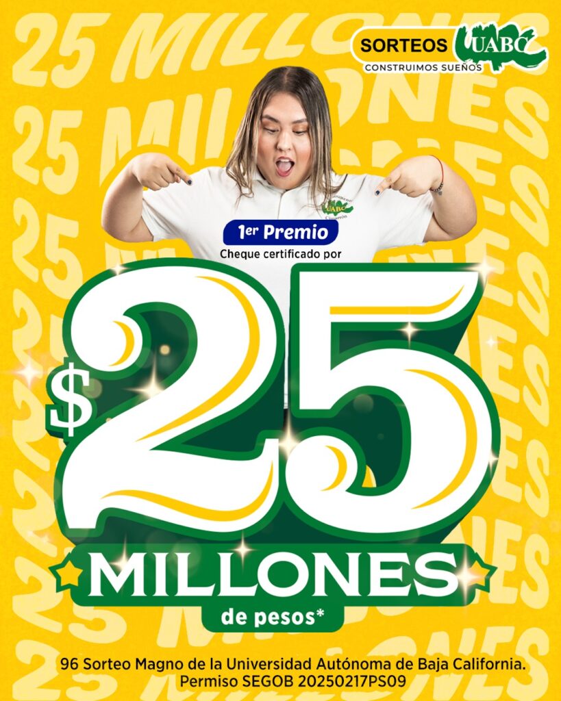 Mexicali.- La Universidad Autónoma de Baja California (UABC) anunció el arranque del Magno Sorteo número 96, cuyo premio principal será un cheque por 25 millones de pesos, además de más de 700 premios, entre ellos automóviles último modelo.