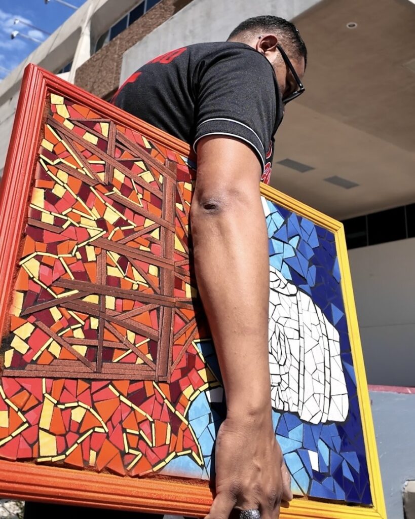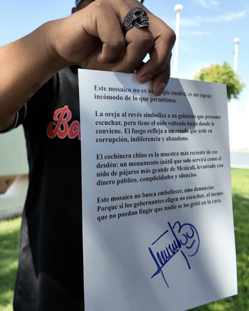 Mexicali.- Este jueves un grupo de artistas del colectivo Boquilla Negra se manifestó frente a la oficina de la gobernadora entregando un mosaico con la figura del “Cocinero Chino” como símbolo de protesta.