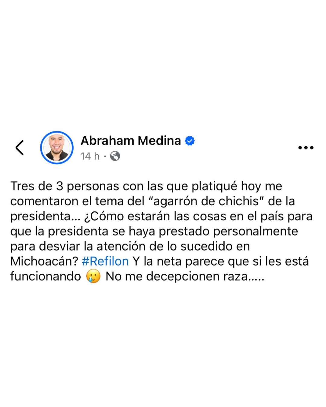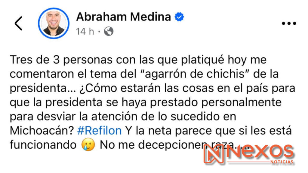 Mexicali.- Abraham Medina, colaborador cercano del diputado local panista Diego Echeverría, desató polémica en redes sociales luego de referirse a la agresión de acoso que sufrió la presidenta de México, Claudia Sheinbaum, como un simple “agarrón de chichis”.