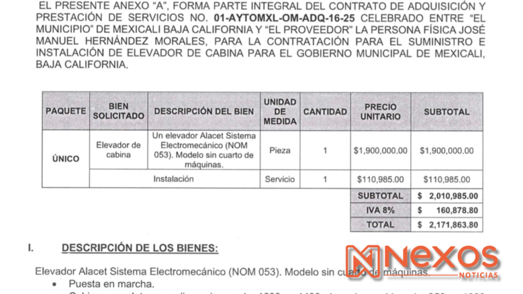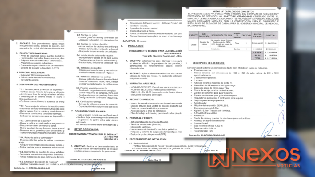 El contrato, identificado como 01-AYTOMXL-OM-ADQ-16-25, fue adjudicado a José Manuel Hernández Morales, el mismo proveedor que suministró el elevador instalado este año en la Dirección de Seguridad Pública Municipal (DSPM), durante la gestión del director Julián Leyzaola Pérez, a diferencia del Palacio Municipal, el elevador de la DSPM tuvo un costo de apenas $796,500 pesos y, aunque fue contratado también para “personas con discapacidad”, se construyó con uso exclusivo para el jefe policial.