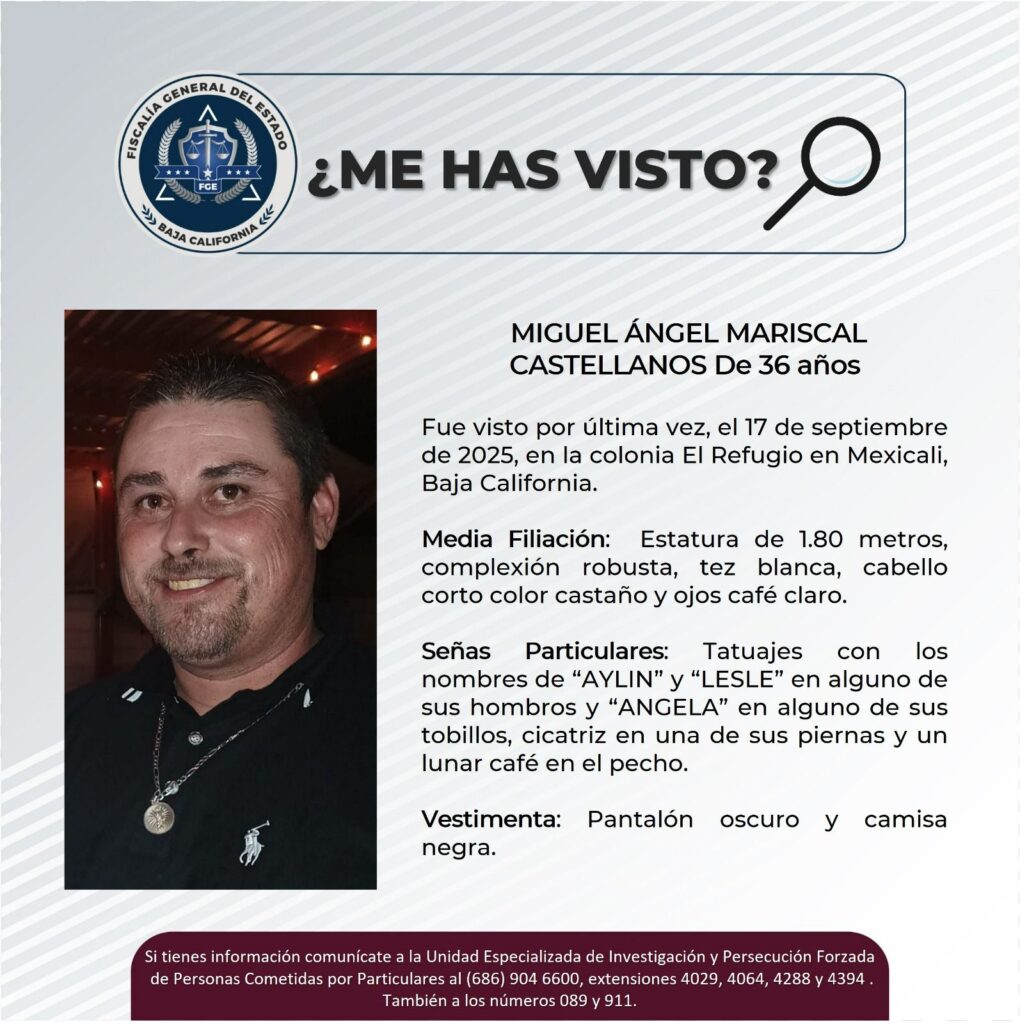 Mexicali.- La Fiscalía General del Estado (FGE) obtuvo la vinculación a proceso y la imposición de prisión preventiva en contra de Sixto Fidel alias “El Chito”, señalado como uno de los presuntos involucrados en la desaparición de Miguel Ángel Mariscal Castellanos, ocurrida el 17 de septiembre de 2025 en Mexicali, un caso que se asocia a una segunda desaparición aún sin resolverse.