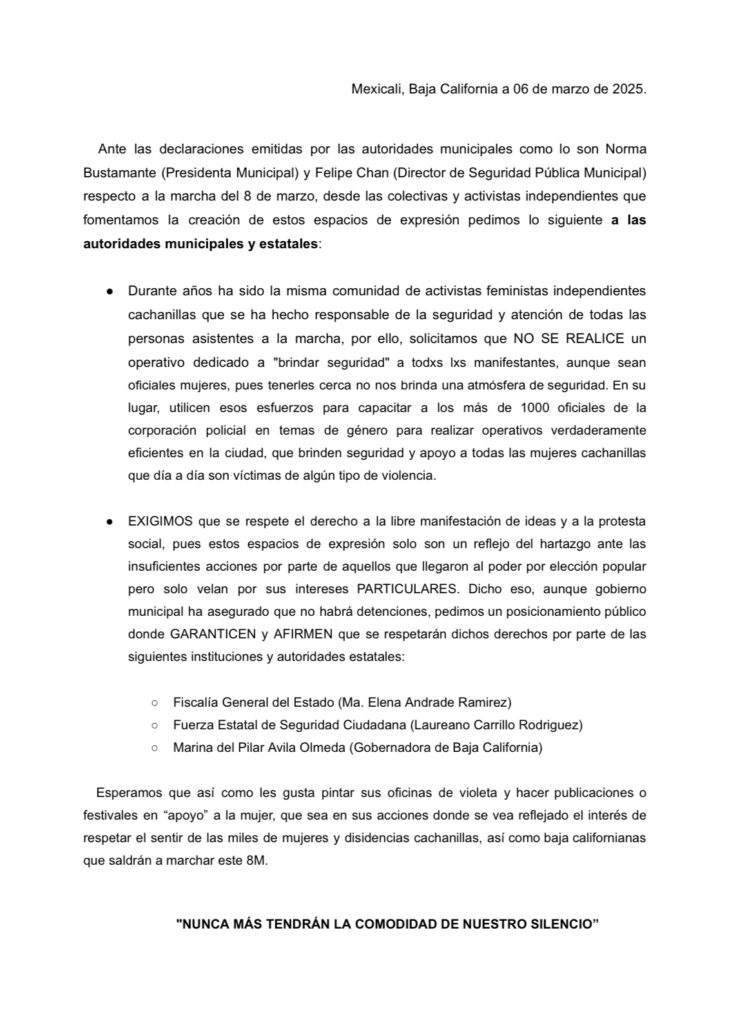 Mediante un pronunciamiento dirigido a la alcaldesa Norma Bustamante, al director de Seguridad Pública, Felipe Chan, y a la gobernadora Marina del Pilar Ávila, las activistas señalaron que históricamente han garantizado su propia seguridad, por lo que consideran innecesario y riesgoso un operativo policial.