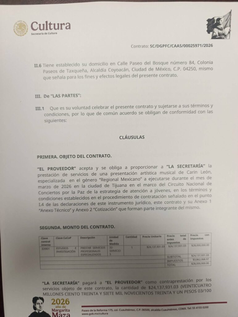Mexicali.- El colectivo artístico de Mexicali “Boquilla Negra” denunció un pago de 28 millones de pesos de la Secretaría de Cultura para el concierto gratuito de Clarín León en la Plaza Monumental de Tijuana el pasado 21 de marzo.