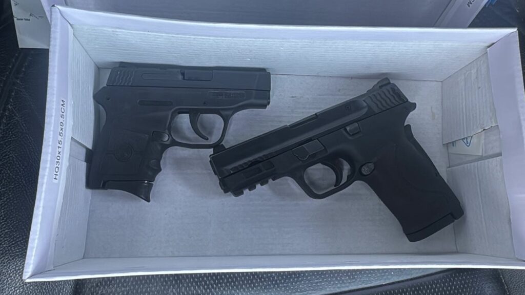 Mexicali.- Dos armas de fuego calibre .380 fueron aseguradas durante un operativo de vigilancia en la colonia ProHogar, un hombre identificado como José Fernando fue detenido por delitos contra la Ley de Armas de Fuego y Explosivos luego de transportarlas al interior de una caja de zapatos.