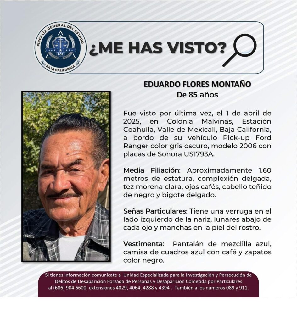 Mexicali.— La Fiscalía General del Estado (FGE), informó la detención y vinculación a proceso de Rosa Esmeralda “N” y Cristian Iván “N”, señalados como los principales sospechosos en la privación de la libertad y posible homicidio de Eduardo Flores Montaño, un adulto mayor de 85 años quién extra oficialmente fue localizado sin vida, aunque a falta de resultados de genética, su paradero aún no ha sido confirmado por las autoridades.