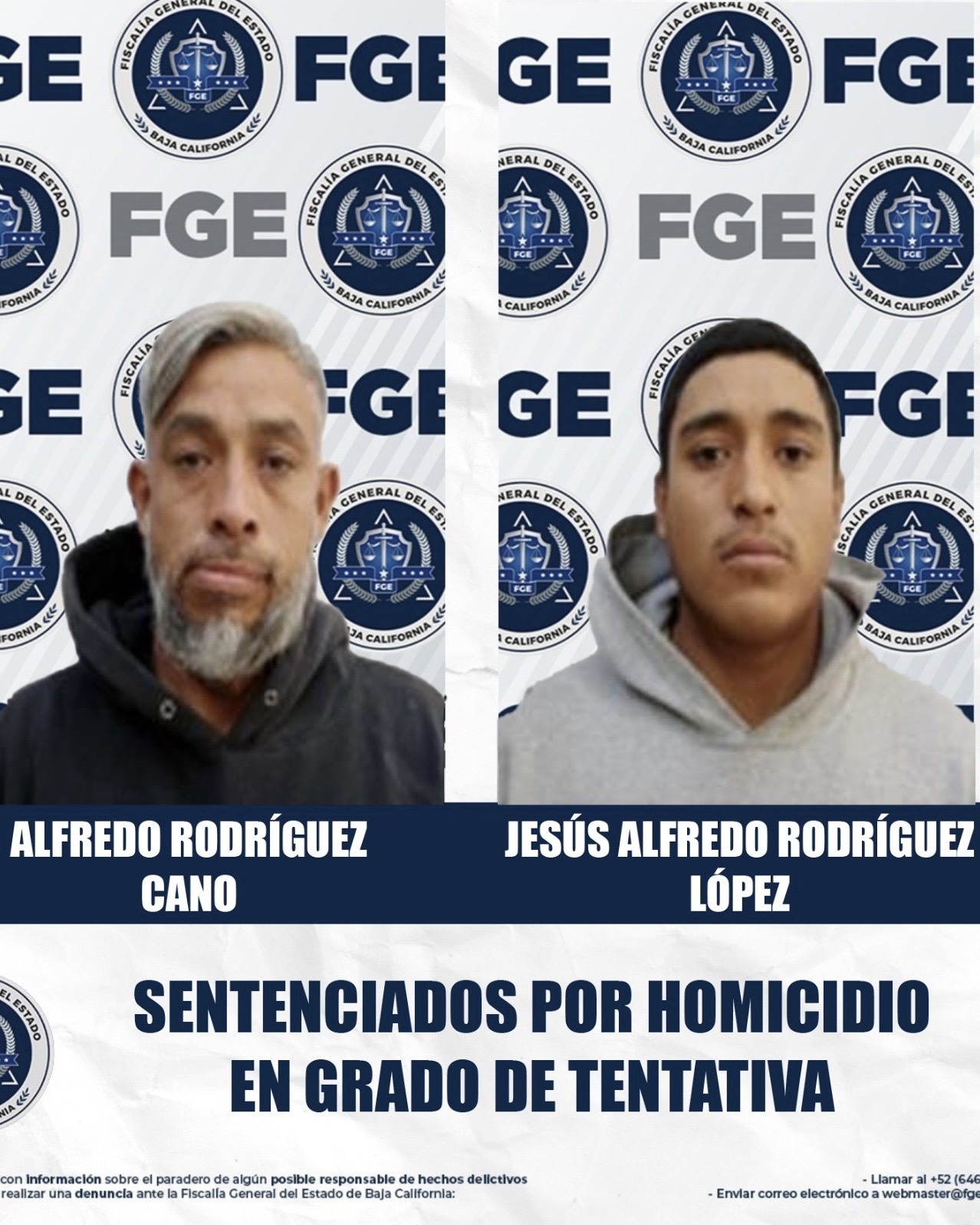 Mexicali.– La Fiscalía General del Estado (FGE) obtuvo una sentencia condenatoria contra Alfredo Rodríguez Cano y su hijo, Jesús Alfredo Rodríguez López, por el delito de homicidio calificado en grado de tentativa, tras un ataque armado cometido contra su propio vecino en la colonia San Clemente, en la zona poniente de Mexicali, cada uno deberá cumplir una pena de 13 años y 4 meses de prisión.