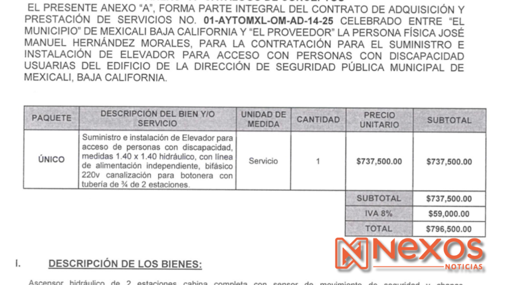 En contraste, el pasado 8 de mayo de 2025 se firmó el contrato No. 01-AYTOMXL-OM-AD-14-25, entre el Ayuntamiento de Mexicali y el proveedor José Manuel Hernández Morales, por un monto de $796,500 pesos, el contrato establece el suministro e instalación de un elevador hidráulico de dos estaciones, con características específicas para facilitar el acceso a personas con discapacidad, en el edificio de la Dirección de Seguridad Pública Municipal, la infraestructura, de reciente construcción, cumple con todos los estándares técnicos de seguridad, capacidad y eficiencia energética. Sin embargo, no está disponible para el público.