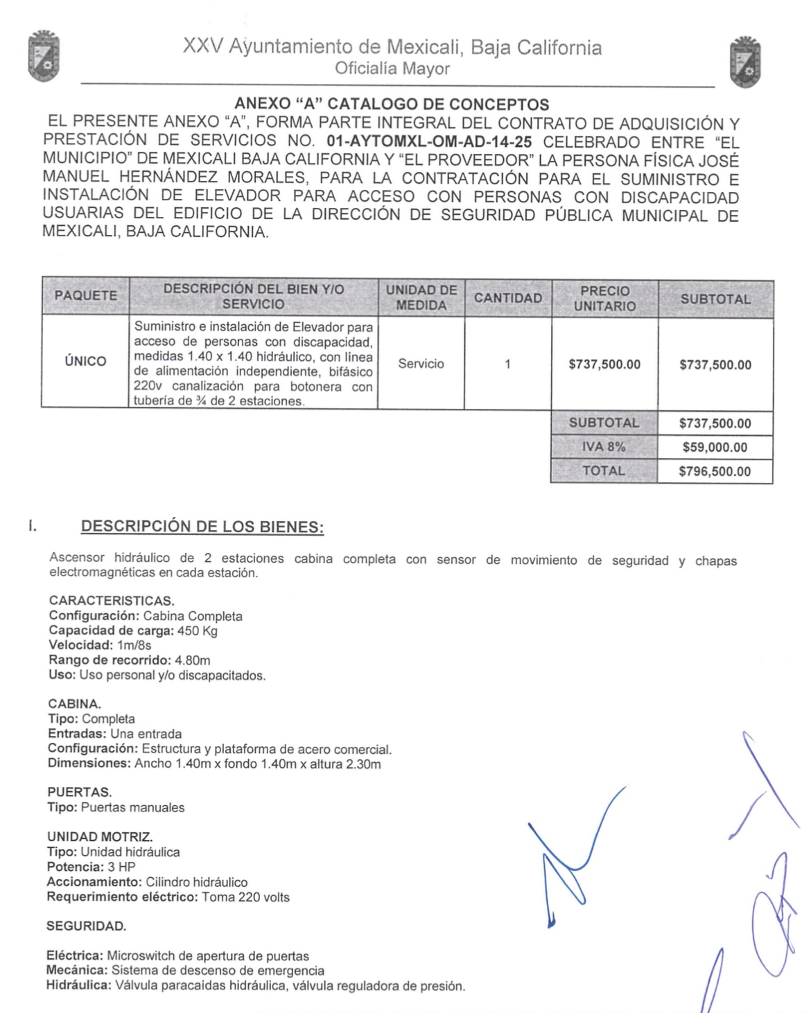 En contraste, el pasado 8 de mayo de 2025 se firmó el contrato No. 01-AYTOMXL-OM-AD-14-25, entre el Ayuntamiento de Mexicali y el proveedor José Manuel Hernández Morales, por un monto de $796,500 pesos, el contrato establece el suministro e instalación de un elevador hidráulico de dos estaciones, con características específicas para facilitar el acceso a personas con discapacidad, en el edificio de la Dirección de Seguridad Pública Municipal, la infraestructura, de reciente construcción, cumple con todos los estándares técnicos de seguridad, capacidad y eficiencia energética. Sin embargo, no está disponible para el público.