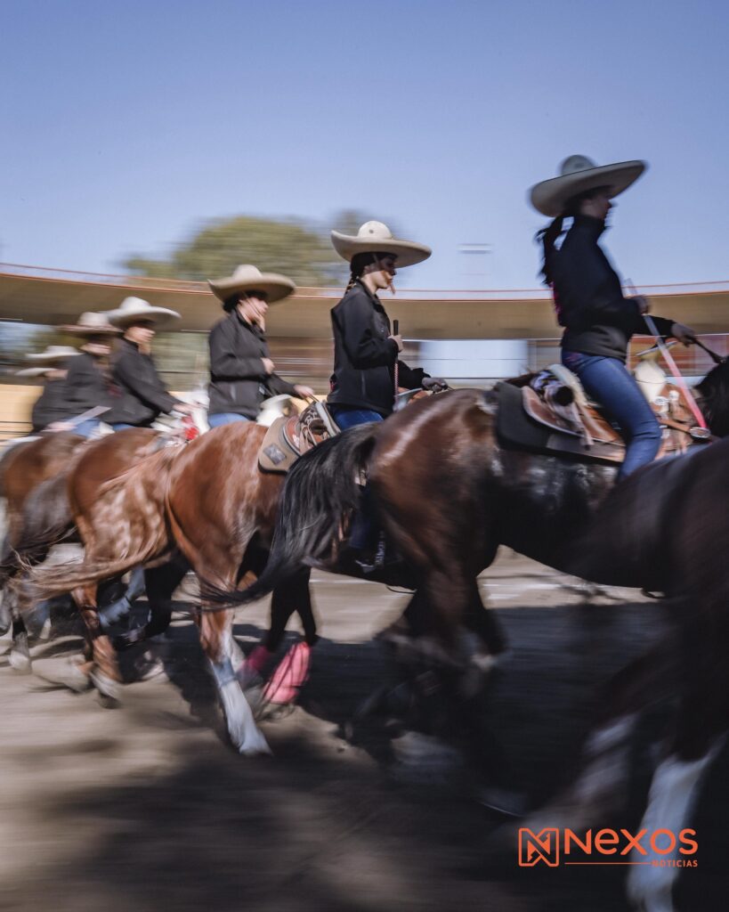 La escaramuza, expresión femenina de la charrería, demanda precisión absoluta; montando a “mujeriegas”, con ambas piernas hacia un mismo costado, ejecutan 12 ejercicios puntuables que combinan velocidad, coordinación y elegancia, cada cruce en el lienzo es resultado de horas de práctica bajo el sol inclemente, de caídas superadas y de una confianza construida entre compañeras.