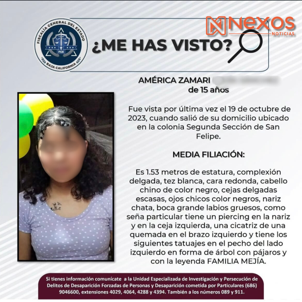 Tijuana.– Una joven de 16 años, identificada como América Zamari, fue localizada con vida en la ciudad de Tijuana por elementos del Escuadrón Violeta de la Fuerza Estatal de Seguridad Ciudadana (FESC), tras permanecer más de dos años como no localizada desde su desaparición en San Felipe.