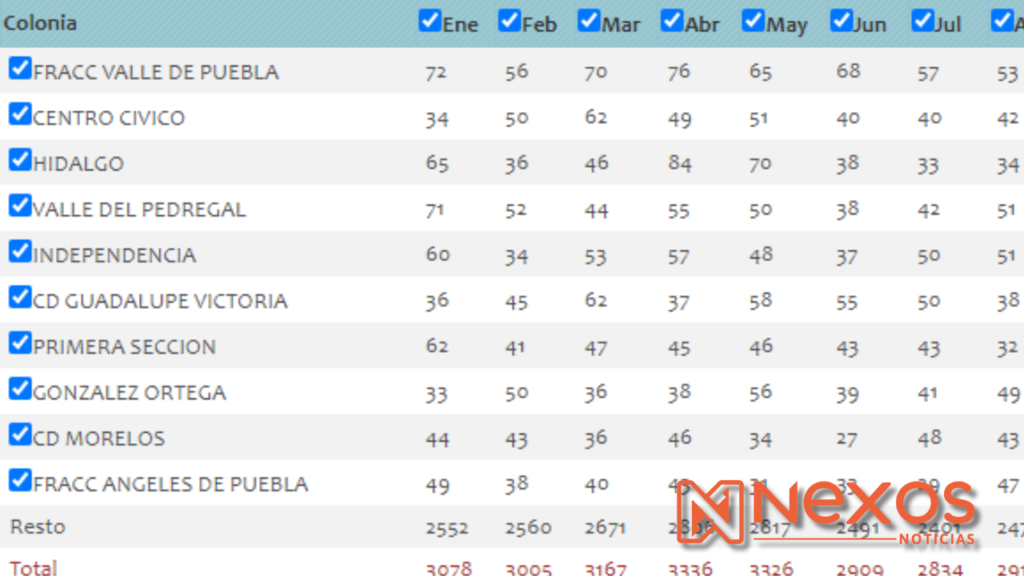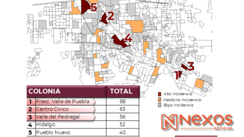 De acuerdo con las estadísticas de la propia Secretaría de Seguridad Pública correspondientes al mes de mayo de 2025, colonias como Fraccionamiento Valle de Puebla (68 incidentes), Centro Cívico (63), Valle del Pedregal (56), Hidalgo (52) y Pueblo Nuevo (40) encabezaron la lista de reportes delictivos.