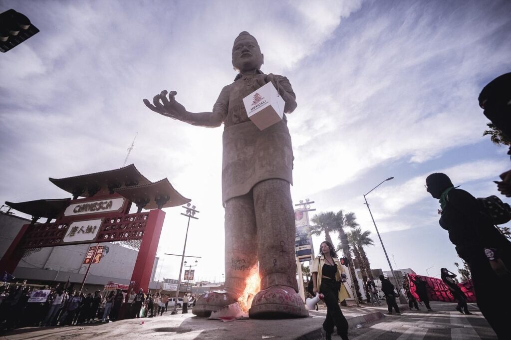 El contingente concluyó su recorrido en el Monumento al Cocinero Chino, donde se vivieron algunos de los momentos más tensos de la jornada. Varias manifestantes realizaron pintas en la base y en la estructura del monumento, mientras otras prendieron fuego en la parte inferior de la escultura. Durante ese momento, algunos grupos corearon la consigna: “No se va a caer, lo vamos a tirar”.
