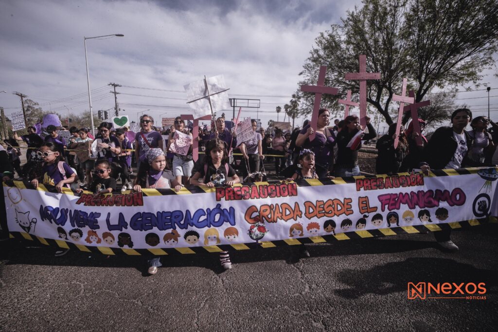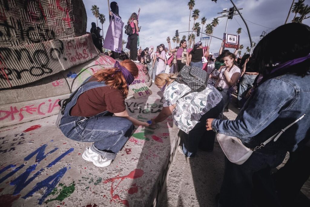La marcha avanzó posteriormente por el bulevar Adolfo López Mateos rumbo al Centro Histórico. Durante el recorrido, familiares de víctimas de feminicidio y desaparición encabezaron parte del contingente, portando fotografías y cartulinas con nombres de mujeres asesinadas o desaparecidas en Baja California.