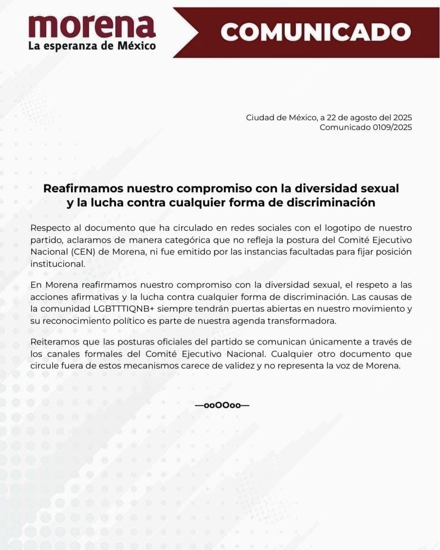 En un posicionamiento difundido este 22 de agosto, Morena aclaró que dicho comunicado “no refleja la postura del partido” y que no fue emitido por las instancias facultadas para fijar posición institucional. La dirigencia nacional reiteró que las posturas oficiales solo se dan a conocer a través de los canales formales del CEN, y subrayó su compromiso con la diversidad sexual, las acciones afirmativas y la lucha contra cualquier forma de discriminación.