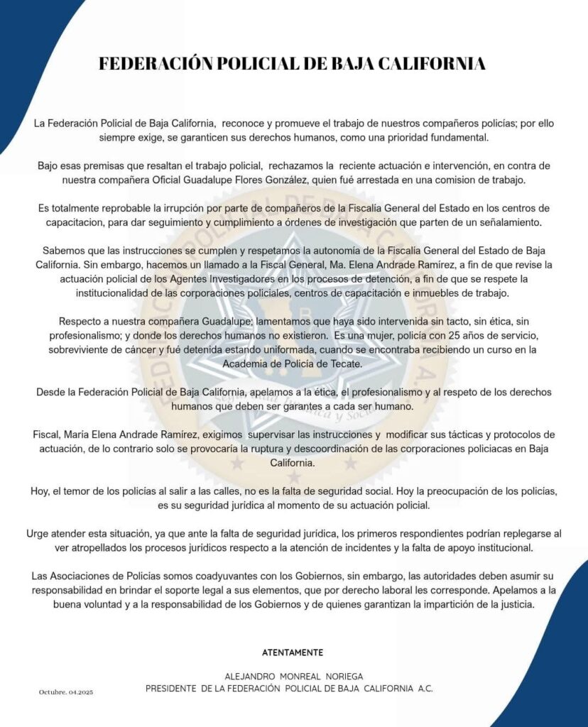El organismo recordó que la oficial es una policía con 25 años de servicio y sobreviviente de cáncer, y lamentó que su aprehensión se haya ejecutado sin consideración alguna hacia su trayectoria. La Federación apeló a la ética y al profesionalismo de las instituciones, advirtiendo que de no modificar los protocolos de actuación, se corre el riesgo de generar ruptura y descoordinación entre corporaciones policiales en Baja California.