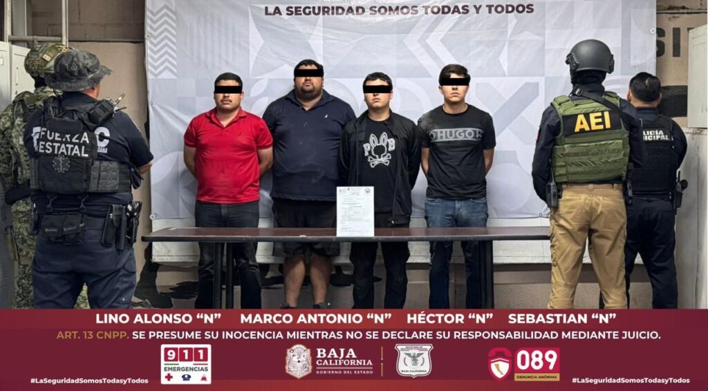 Posteriormente, autoridades confirmaron la captura de cuatro individuos, los detenidos fueron identificados como Marco Antonio “N”, de 20 años, originario de Michoacán; así como Lino Alonso “N”, de 21 años; Sebastián “N”, de 19; y Héctor “N”, de 26 años, estos últimos con origen en Mexicali.