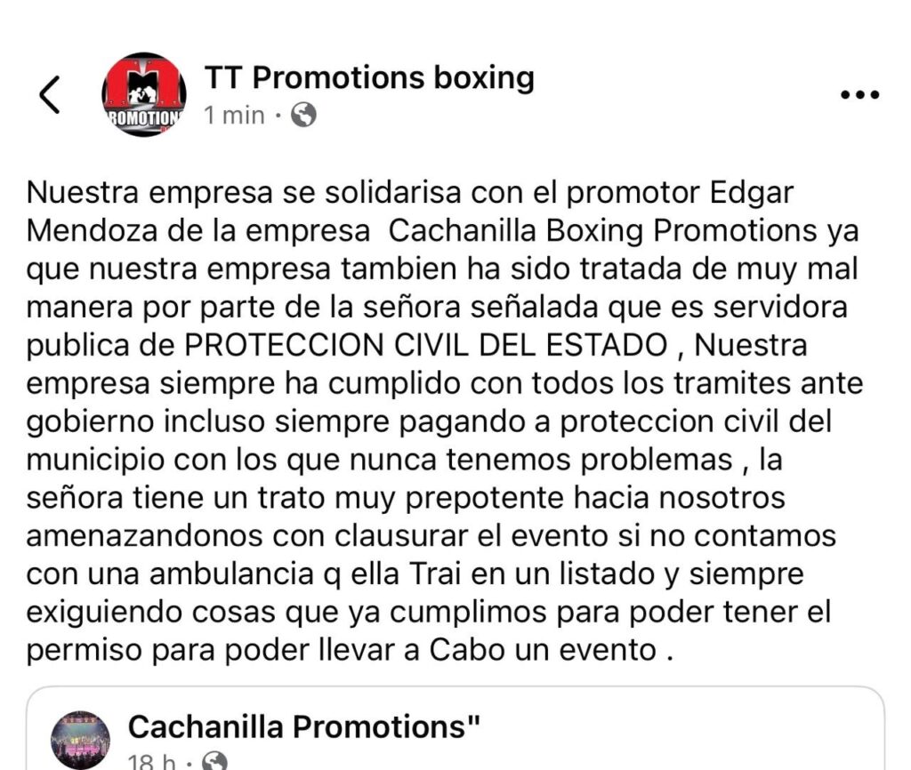 “nunca me ha pasado esto ni a compañeros que yo lo sepa, de 12 años que a nadie ni a otros compañeros que promueven boxeo aquí en Mexicali, jamás les había pasado esto hasta que llegó esta funcionaria… y todavía lo grita, a los cuatro vientos de que ella es la única responsable de Protección Civil del Estado aquí en Mexicali, y les guste o no les guste”, enfatizó.