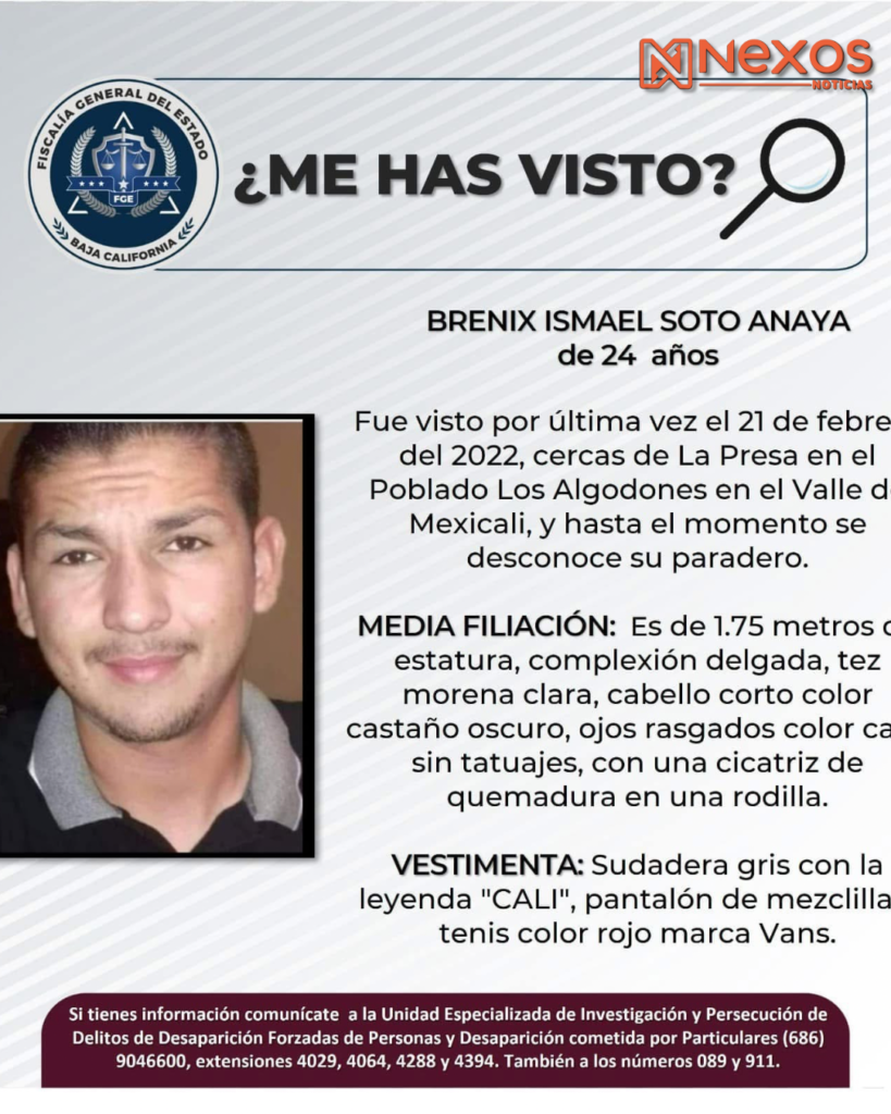 Otro expediente expuesto corresponde a febrero de 2022, Brenix Ismael Soto de 23 años, circulaba en el poblado Vicente Guerrero cuando fue interceptado por Humberto “N”, policía municipal en activo que conducía una patrulla oficial, la fiscalía sostiene que el agente actuó por órdenes de integrantes de un grupo delictivo que operaba en la región, el cuerpo de Brenix fue localizado enterrado en un predio de la colonia La Ladrillera en Enero del 2024.