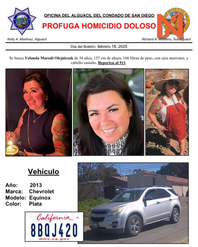 Mexicali, B.C. – Yolanda Marodi, de 53 años, es la principal sospechosa del homicidio de Rebecca Marodi, capitana del Departamento de Bomberos de Cal Fire, ocurrido el pasado 17 de febrero en Ramona, California. La Oficina del Alguacil del Condado de San Diego informó que la mujer, quien también usa los apellidos Olejniczak, Ramos y Gaeta, sigue prófuga, y existe la posibilidad de que haya cruzado la frontera hacia Mexicali.