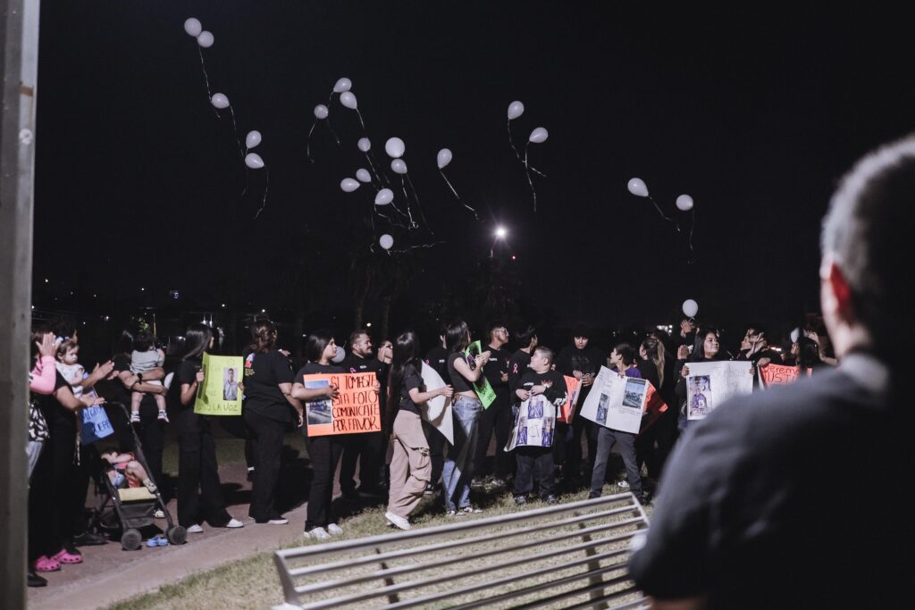 Bajo la noche de este 1 de Abril, decenas de globos blancos se elevan en silencio mientras familiares y amigos sostienen cartulinas fluorescentes con mensajes directos: “Si tienes información, habla, no calles” y “Queremos justicia”. Niños al frente, algunos con la mirada fija y otros ocultando el rostro entre las manos, exhiben una escena que interpela más allá del caso, la justicia ausente se extiende en forma de incertidumbre.