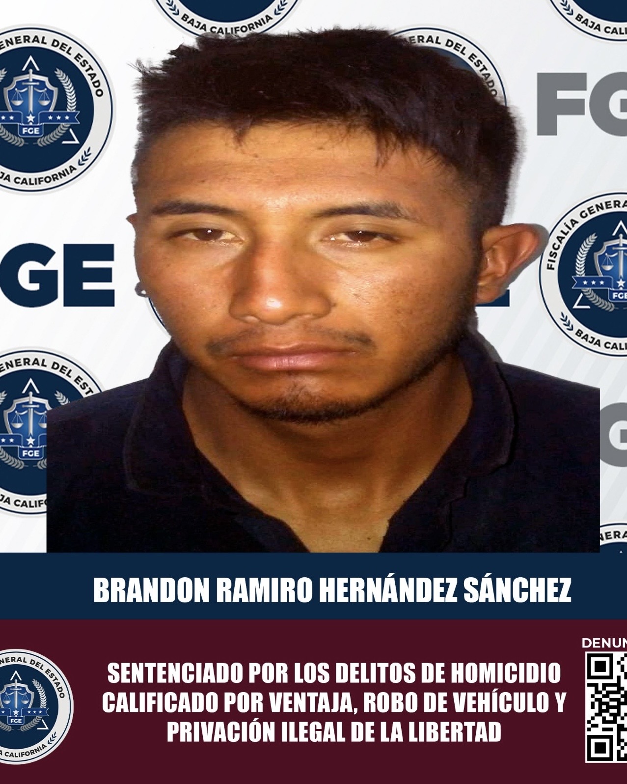 Mexicali.- A casi dos años del crimen registrado en el Valle de Mexicali, la Fiscalía General del Estado (FGE), informó que Brandon Ramiro Hernández Sánchez fue sentenciado a 39 años y 6 meses de prisión por los delitos de homicidio calificado, robo de vehículo y privación ilegal de la libertad en contra del matrimonio de Isidro Salvador y Natalia; la condena se dictó a través de un procedimiento abreviado.