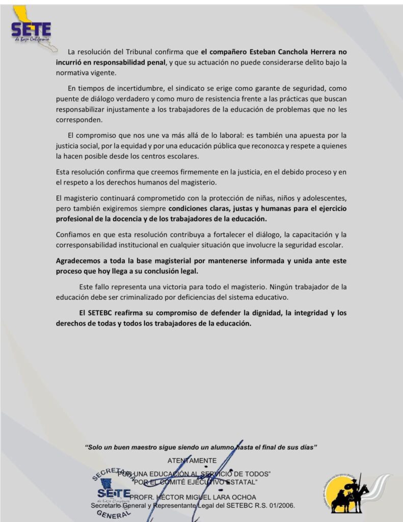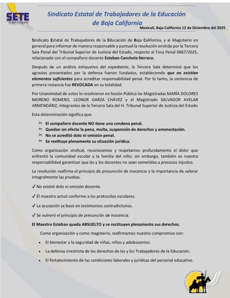 El Sindicato Estatal de Trabajadores de la Educación de Baja California (SETEBC) informó que esta resolución confirma que el docente no cuenta con condena penal alguna, y que su actuación se apegó a los protocolos escolares vigentes. Asimismo, señaló que la acusación se sustentó en testimonios contradictorios y que, durante el proceso, se vulneró el principio de presunción de inocencia.