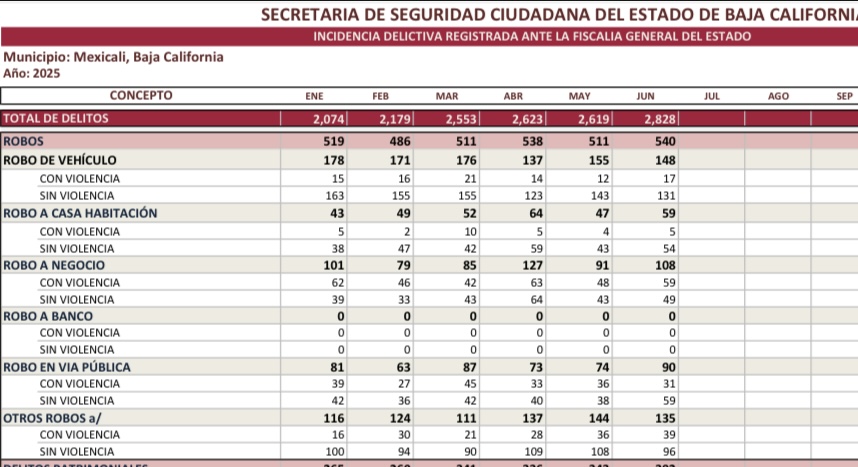 Mexicali.- En los primeros seis meses de 2025, el municipio de Mexicali registró un total de 3,105 robos, lo que representa un promedio diario de 17 delitos en esta categoría, de acuerdo con datos oficiales de la Fiscalía General del Estado (FGE), la cifra engloba atracos a vehículos, viviendas, negocios y transeúntes, tanto con violencia como sin ella, y refleja una problemática persistente que parece no encontrar contención real desde el ámbito de seguridad pública.