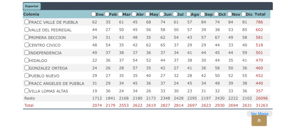 Más abajo en el ranking se ubican Centro Cívico (518), Independencia (501) e Hidalgo (470), colonias con alta densidad poblacional y movilidad constante, factores comúnmente asociados a mayores oportunidades delictivas, el listado continúa con González Ortega (460), Pueblo Nuevo (452), Fracc. Ángeles de Puebla (440) y Villa Lomas Altas (357), completando el Top 10.