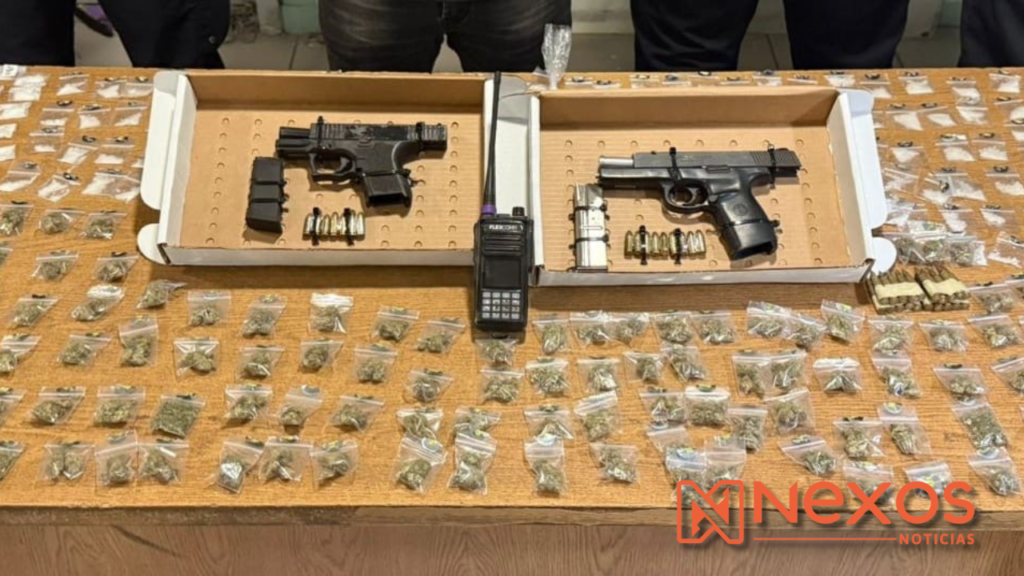 Durante la huida, el sospechoso habría disparado nuevamente contra los agentes, intentando refugiarse en un domicilio, al ser asegurado, los policías localizaron en su poder dos armas de fuego calibre 9 milímetros, una bolsa con 20 cartuchos .223, un radio de comunicación y más de 240 envoltorios con marihuana y metanfetamina.